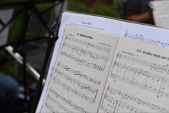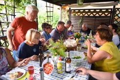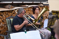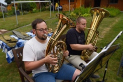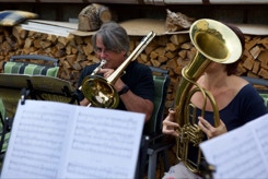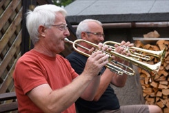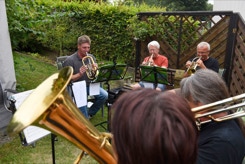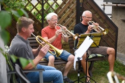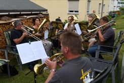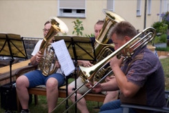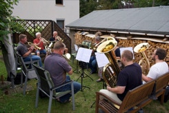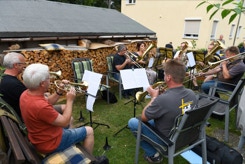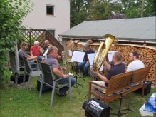 Diesmal hatten wir auch die Instrumente dabei, um die Stücke für das Ständchen zum 50. Geburtstag unseres Bläsers Hannes zu proben. Da einige Bläser nicht mehr vor Ort wohnen, war das die Gelegenheit fast alle zu versammeln. Nachdem wir die öffentliche Probe für alle Nachbarn beendet hatten, ging es über zum gemütlichen Teil. Bei herrlichem Sommerabendwetter saßen wir noch lange zusammen.