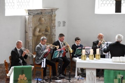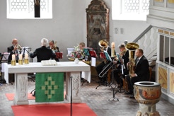Nach langer Zeit mit coronabedingten Einschränkungen haben wir am 06. Juni 2021 endlich wiedermal im Gottesdienst geblasen. Höchste Zeit… An diesem Sonntag hat unser Chor einen Bläsergottesdienst zur Jahreslosung ausgestaltet. Auch wenn wir uns auf Grund bestehender Sicherheitsbestimmungen hinter dem Altar platzieren mussten, so war das gemeinsame Musizieren im Rahmen eines Gottesdienstes für alle ein echtes langersehntes Highlight. Sogar unsere beiden Anfänger Jakob und Aaron waren mit am Start und wurden vom Chorleiter der Gemeinde vorgestellt. Wir hoffen, dass beide weiterhin zur Stange halten und fleißig üben, damit sie immer öfter bei Auftritten des Chores mitblasen können. Wir freuen uns jedenfalls über die Verstärkung und wünschen beiden viel Spaß und Freude in unserem Posaunenchor.